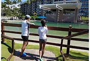 여긴 수영장 주변 산책로예요. 지금 딸아이는 열심히 Menehune Adventure Trail 게임 중이예요. 이 게임을 하기 위해서는 게임전용 아이패드를 1층에 위치한 Pau Hana Room에서 대여해야해요. 게임은 2종류예요. 메인 로비 주변을 탐험하는 게임과 수영장 주변을 탐험하는 게임이 있는데 로비쪽 게임은 좀 단순해서 금방 끝나더라구요. 수영장 주변 탐험하는 게임이 훨씬 재미있어요. 단, 한국어 서비스는 안되요~